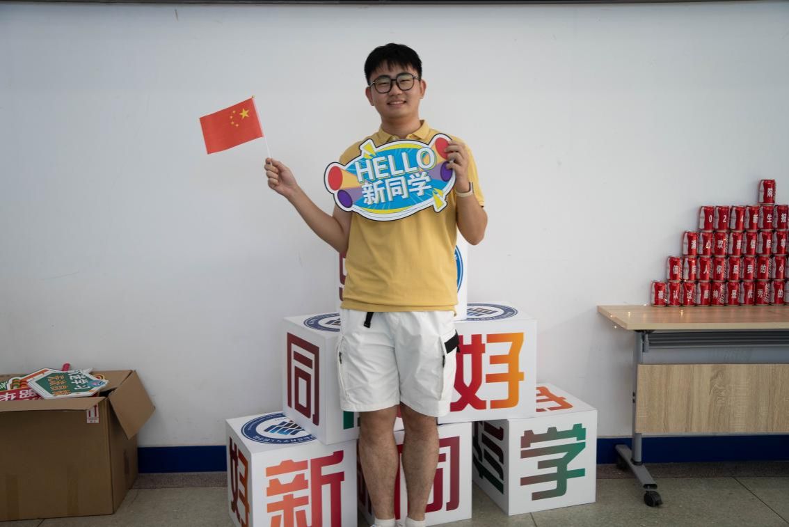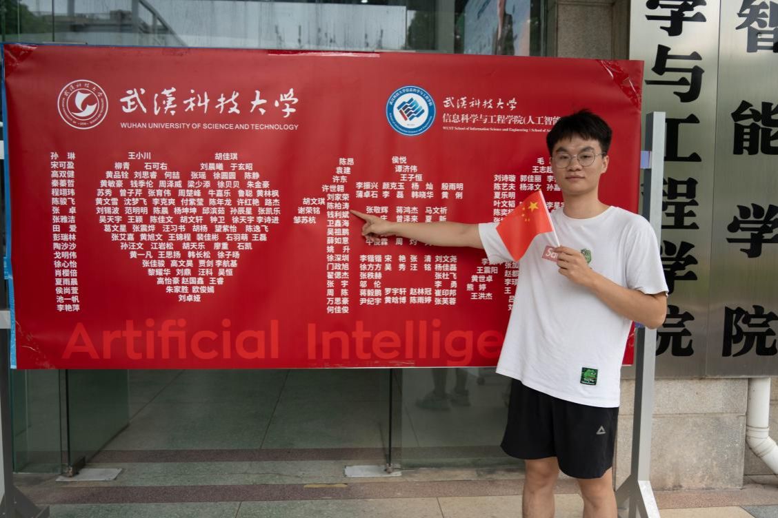 图5:新生在公司门口字云图海报前打卡 李轲摄