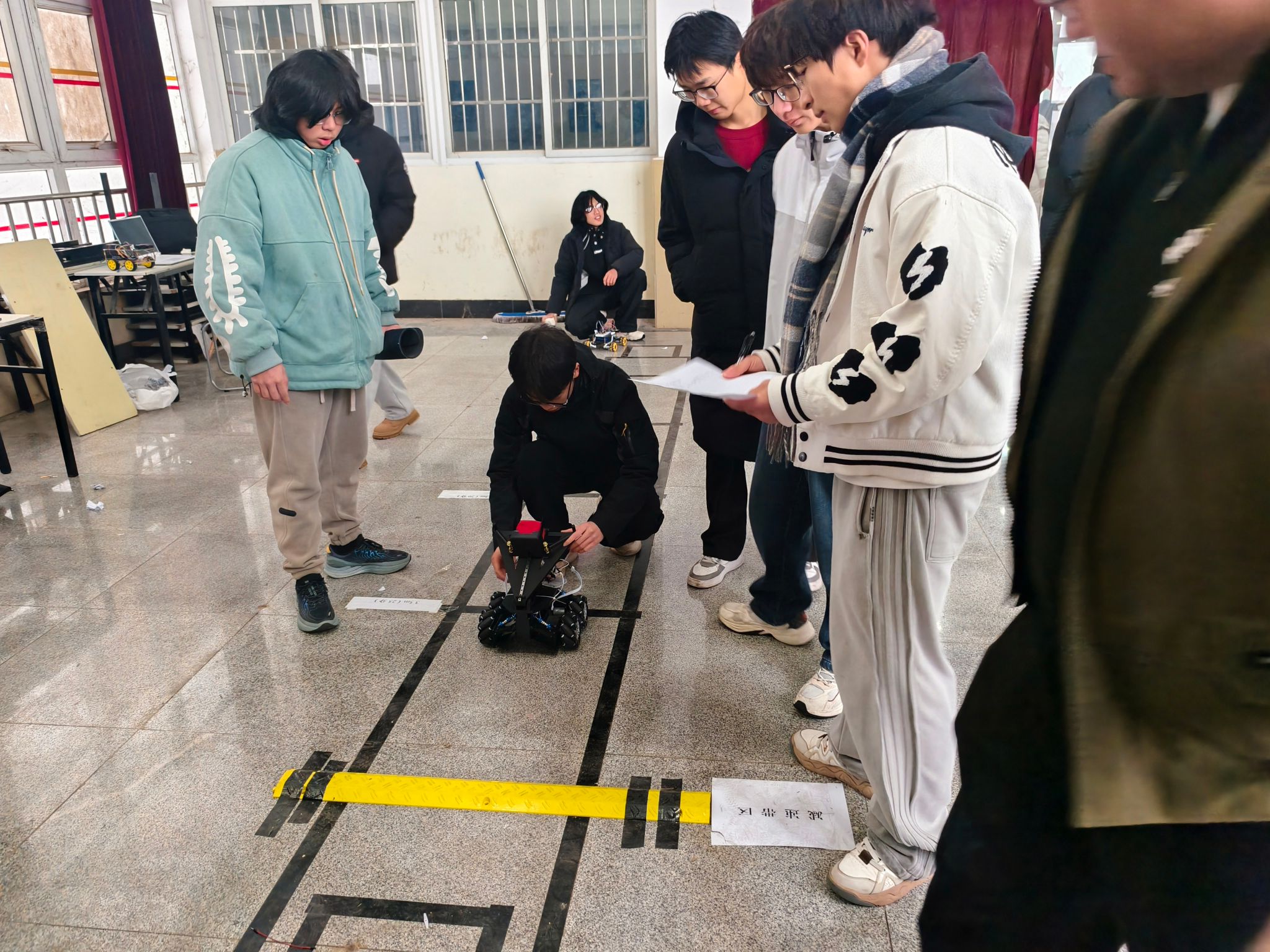 决赛当日,武汉遭遇极端冰雪天气,凛冽的寒风与湿滑的道路给出行带来了极大不便,但这丝毫未减学子们的参赛热情。全体参赛队员冒雪集结,准时抵达赛场,用实际行动诠释了对科创竞赛的执着与热爱。决赛现场气氛紧张热烈,各参赛队需在限定时间内完成信息显示、直线竞速、避障越坎、沙包定点投掷等多项任务。赛场上,一辆辆经过反复调试的智能小车疾驰穿梭,有的凭借优化算法在竞速环节一马当先,有的依靠精巧结构稳稳通过减速带,部分队伍更成功挑战了原地掉头等高难度附加动作。每一次精准的控制与流畅的运行,都赢得了现场阵阵喝彩,充分展示了武科大新生扎实的工程素养。