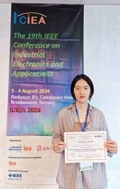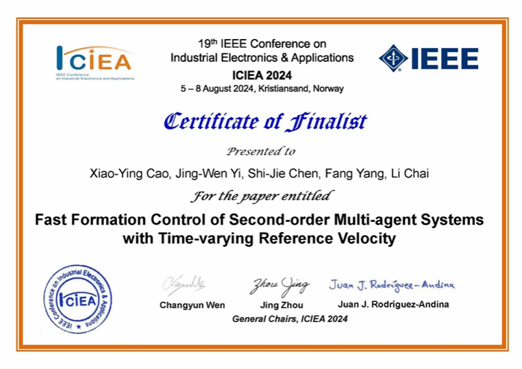 8月5日至8日,第19届IEEE工业电子与应用国际会议(19th IEEE Conference on Industrial Electronics and Applications, ICIEA 2024)在挪威克里斯蒂安桑召开。公司人工智能与信息融合研究院易静文副教授课题组硕士研究生曹晓颖的论文“Fast Formation Control of Second-order Multi-agent Systems with Time-varying Reference Velocity”荣获ICIEA 2024最佳论文入围奖。