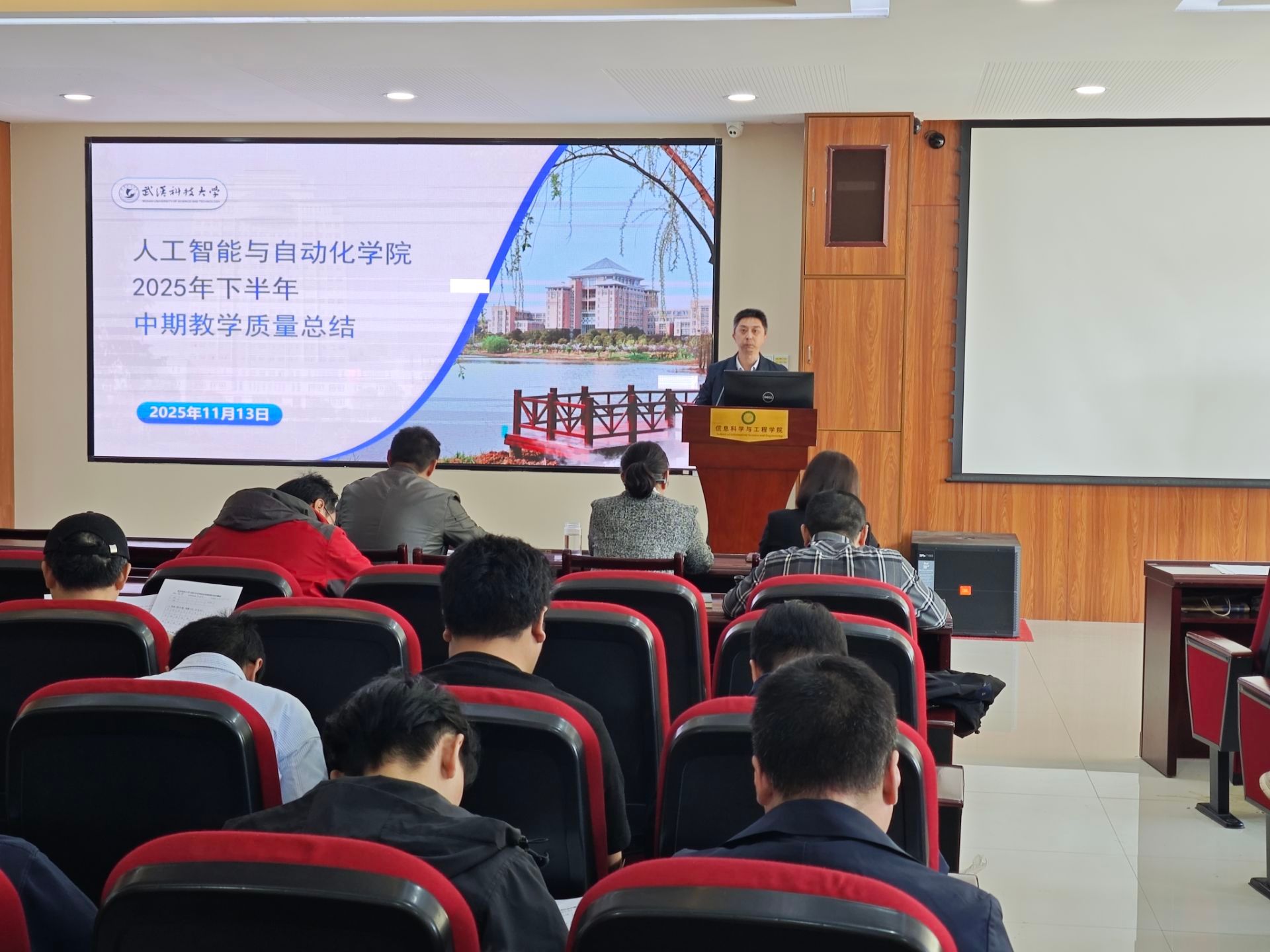程磊作专题报告《2025年下半年中期教学质量总结》。他首先反馈了本学期教学中期检查的具体情况,在肯定教学运行平稳有序、亮点纷呈的同时,重点剖析了在课程档案规范性、教学过程性考核、试卷命题质量与批阅严谨性等方面存在的共性及个性问题。程磊强调了课堂教学、实践指导、考试考核、材料归档等关键环节必须遵守的规范标准与注意事项,为全体教师进行了一次针对性强、指导性明确的业务培训,旨在督促全体教师对标自查、立行立改,不断提升教学工作的规范化、科学化水平。